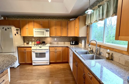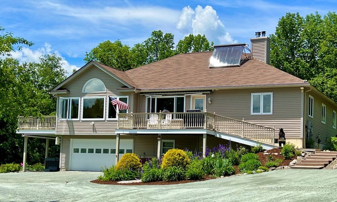 This private, Jefferson NH home is located on 40 peaceful acres and offers privacy, stunning Mountain Views, and a mile and a half of private wooded trails. This home features an open concept living space, high speed internet, and a fully stocked kitchen. It is energy efficient with solar panels for both electricity and hot water and has a standby, automatic generator just in case of power outages! It also has Central A/C for those toasty days and a pellet stove for the cold nights!