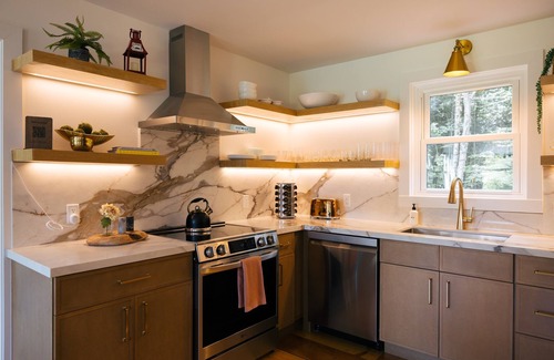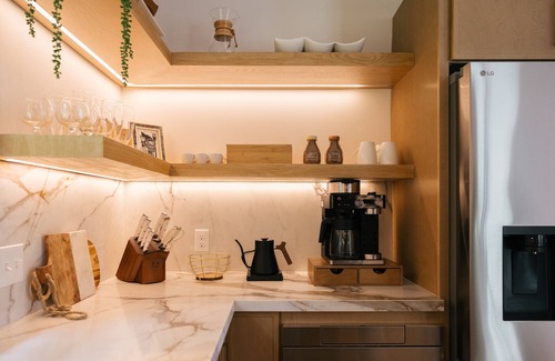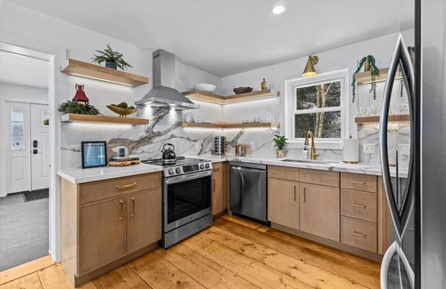 KITCHEN: Our designer-inspired, open concept modern kitchen with includes: new stainless steel LG induction cooktop, range hood & oven, microwave, glass front refrigerator, and retro Smeg toaster; Ninja expresso/coffee maker; custom-built White Oak floating shelves stocked with glassware and mugs, plates & bowls, etc shaker-style cabinets house cooking and baking supplies, cutlery and silverware, induction-safe pots & pans, a Kitchenaid blender, electric griddle, pitchers, serving trays, and much more. We provide locally-sourced coffee, and hot cocoa, and offer an assortment of teas and kitchen basics (spices, salt & pepper, sugar).