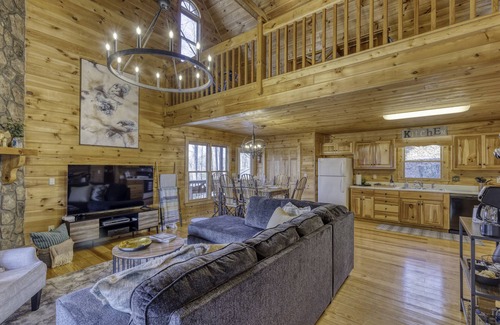 Inside, the spacious layout of the cabin is immediately apparent. The cabin includes a fully equipped kitchen, four bedrooms (one on the lower level, one on the main level, the master suite on the top level, and a loft bedroom outside the master suite overlooking the family room).