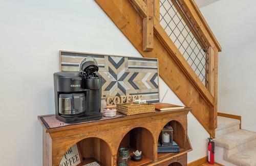 To make your stay even more enjoyable, the cabin includes several thoughtful amenities. The dedicated coffee bar is a great place to start your day, offering everything you need to brew your favorite coffee or tea. A cozy reading nook provides a quiet spot to curl up with a good book, while the luxury bed and bath linens add an extra touch of elegance and comfort to your stay. Every detail has been carefully considered to ensure that you feel right at home.