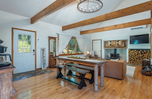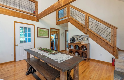 The heart of the cabin is the spacious, light, and airy living room. Large windows allow natural light to flood the space, creating a bright and welcoming environment. The woodstove adds a touch of rustic charm and provides cozy warmth on cooler evenings, making it the perfect place to gather with loved ones. Whether you're playing games, watching movies, or simply enjoying each other's company, this living room is designed for comfort and relaxation.