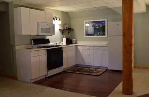 Beautiful private apartment with walkout access to patio, fire pit, parking and shared hot tub (no children under 12 in tub). Apartment is fully equipped with queen bed, HD DirecTV, full kitchen, dining area, bathroom with infinite hot water, and big couch in living room. Approximately 900 square feet of space.