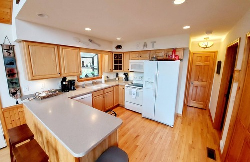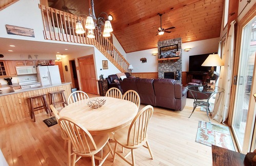 The fully-equipped kitchen, dining room and main living spaces all flow together for a roomy, light and open floor plan. Big 60” LED TV for viewing your favorite shows/movies on the reclining leather sofas. The stone, gas-log fireplace is perfect for gathering around during those cooler months. Sit around the dining room table as a family and admire the mountain views out the windows as you enjoy your meals. Or, dine outside on the deck!