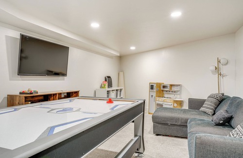 - The air hockey table seen in the basement photo is no longer available