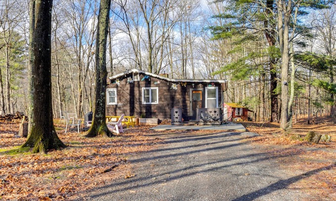 Located within a charming forest in Round Top and surrounded by stunning mountain vistas, this 2-bedroom, 1-bath vacation rental cabin is ideal for your next Catskills escape! Start your day with a hearty breakfast in the kitchen before exploring Kaaterskill Falls or hitting the slopes at Windham Mountain Club. As the sun sets, relax in the hammock or gather around the fire for s’mores!