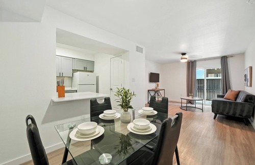 Stylish, fully furnished apartment in Austin’s Mueller neighborhood. Features include quartz countertops, modern lighting, sleek hardware, and plenty of natural light. Enjoy a spacious layout with a comfy living area, fully equipped kitchen, and in-unit washer/dryer. Designed for comfort and convenience—perfect for short or long stays!