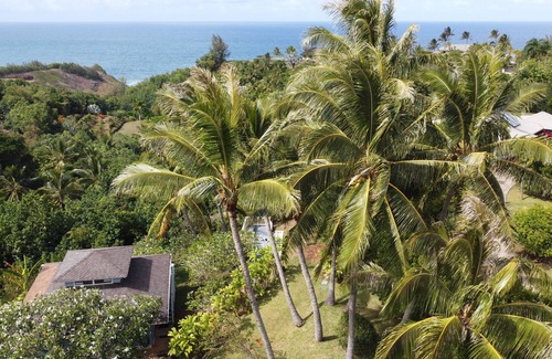 The property is located on the edge of a bluff overlooking the ocean and below the home is a gorgeous secluded beach where you can easily and often find yourself in absolute privacy on a white sand Hawaiian beach- it is truly paradise!