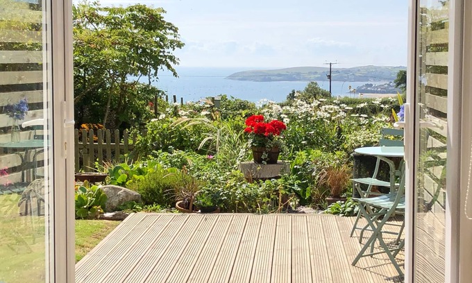 With modern decked area with bistro-style table and chairs all surrounded with established borders and offering far reaching sea and countryside views.