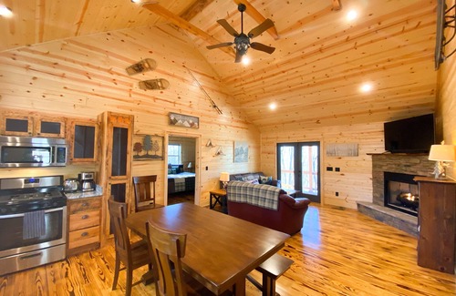 Luxury cabin on a wooded acre with long range mountain view from the spacious wraparound porch. Rest and refresh by the gas fireplace or fire pit and enjoy the comforts of home with a full kitchen and dining area. Each bedroom has it's own private bathroom. Pull out sofa in the living room. Fiber internet. Adventure out to find hiking trails, waterfalls, rivers, creeks, lakes, boating, and fishing. Reconnect in this tranquil oasis, investing in rich and rewarding adventures together.