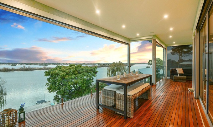 This remarkable home features four spacious bedrooms, comfortably sleeping up to 14 guests. Enjoy the luxurious furnishings and tasteful decor throughout the property, which create a romantic ambience. The large balcony overlooks the picturesque Murray River and includes a private jetty and beach, ideal for pre-wedding photo sessions or leisurely moments after the ceremony. Additional amenities include Foxtel for entertainment, well-equipped kitchen facilities, and a huge backyard where pets can frolic freely during your stay.