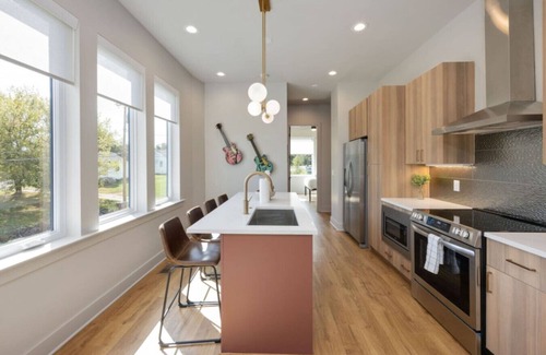 This beautiful townhome offers you four bedrooms and four full bathrooms. Your group will have plenty of space to sleep with three queen beds and a king bed in the master suite! The open concept kitchen and living space gives you ample room to be together and enjoy your trip! You can also enjoy your morning coffee (or some pre-Broadway beverages) on the gorgeous rooftop, while playing a friendly game of cornhole. Enjoy all the perks of the city, while relishing the peace of a quiet local neighborhood.