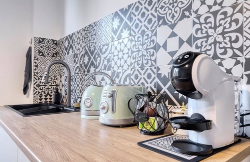 The kitchenette is equipped with a refrigerator, as well as a coffee maker, an electric kettle, and a microwave. Bathroom amenities include a hair dryer, a bidet, and towels. Other amenities at this 1-bedroom, 1-bathroom rental include bed sheets, heating, and a dining table.