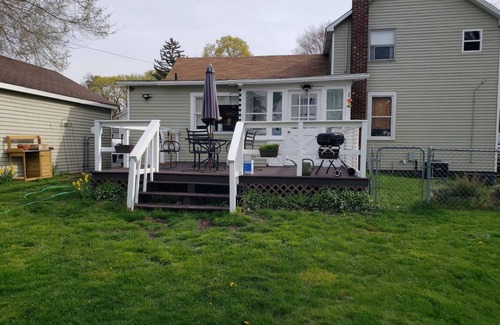 This house was built in 1920 and is part of a two-unit space. This is the lower unit with a large fenced in back yard. This space has many different guitars and instruments, all playable and functional. A musician's playground. Much of the décor is concert posters from our travels! Located with Muskegon Lake views from the backyard and within walking distance to the heart of downtown Muskegon, Ice arena and Heritage landing. Only a 5-minute drive to Lake Michigan and Pere Marquette beach.