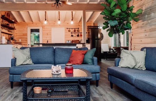 Newly renovated cottage feels like a modern version of a rustic cabin with pine cladding throughout.