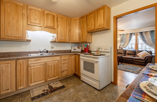 When entering, you walk into the welcoming living room with ample of seating, a television, and a fireplace. The kitchen has room to prepare and cook meals with an eat in kitchen table. A full size washer and dryer are also located in the kitchen. Bedroom 1 offers a king bed with ample clothing storage and plenty of space. Down the hall is bedroom 2 with a queen bed and closet space. Located between the bedrooms is the bathroom with a tub/shower combo with grab bars. Mustang Hideaway is perfect for couples, friends, or a small family!