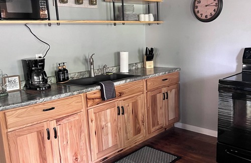 Relax with your family & friends in this peaceful cabin at Nolin lake. We are located past the Ponderosa Marina turn off on a private road. Our home has been completely remodeled with some finishing touches still being completed but we are ready to share it and for you to enjoy it. You can relax and truly enjoy nature from almost any view. You can access the lake via a short walk so bring your rafts, sunscreen and picnic basket. Our home has a private drive with steps down to a beautiful front deck. When you enter the front door experience an open floor plan. Our living room offers plenty of seating to kick back and relax. The kitchen has everything you will need to enjoy home cooked meals with a built in bench surrounded by windows to watch the wild life off the back deck. We have 2 bedrooms - one with a queen bed and the other has a queen bunk bed w/ twin on top. The bathroom has a shower w/ bench, fresh towels, soap, body wash, shampoo, conditioner and tp provided. There is a side door out to a deck that wraps around the back of home to truly enjoy mother nature. A very peaceful setting w/ outdoor furniture to sit and enjoy. We offer a gas grill and firepit for those campfire nights.