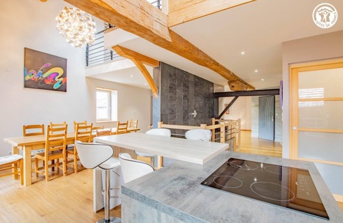 Charming authentic traditional farmhouse of character from the 19th century, carefully restored, nestled in the peace and quiet of a picturesque rural hamlet, perched on a "balcony" on a south-east facing hillside. Total tranquility in the heart of the rolling Matourine countryside, in the hollow of a preserved bucolic setting of wooded meadows, on the edge of a wild forest, on the first foothills of the gentle Saint-Cyr mountain (unique belvedere offering an exceptional panoramic view as far as Mont-Blanc on a clear day!), close to the many amenities of the charming village of Matour, labeled "Green Holiday Resort" (a renowned ecotourism label dedicated to "nature" destinations). Spacious, very comfortable gîte. Large living room with very beautiful volume. Atypical architecture in the spirit of a "loft in the countryside" (including "cabin" rooms on the "second day"). Warm country & mountain character with contemporary accents enhanced by the original beams & framework. Elegant & opulent atmosphere. Lots of charm. Cozy & cozy. Sheltered balcony-terrace completed by a pleasant enclosed, lawned & planted garden, sheltering a swing & a gravel terrace (with summer kitchen a stone's throw away). Magnificent open view of the surrounding countryside. Composition: Semi-detached village house. Electric central heating + wood stove. Wifi (fiber). Ground floor: bedroom (double bed 140x190cm) with private bathroom (shower), laundry room, separate toilet. 1st floor: living room-kitchen-lounge, 1 bedroom on the "second day" without direct opening to the outside (double bed 160x200cm) with private bathroom (shower), separate toilet. 2nd floor: TV lounge on the mezzanine (double sofa bed 140x190cm as an extra), 2 bedrooms including 1 "second day" (3 single beds 90x190cm including 2 bunk beds / double bed 140x190cm), bathroom (shower + "built-in bathtub" + WC). Sheltered balcony-terrace + gravel terrace & enclosed garden 100m² (not adjoining / alley to cross) + private parking. Shops including mini supermarket 3 km away.