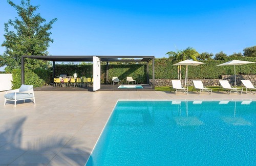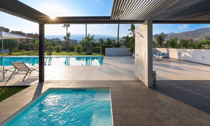 Villa Inga is a luxury property with private pool located near Taormina. This newly built villa is immersed in a beautiful garden with lawn and boasts wide terraces, a large swimming pool (m 8 x 21) and a Jacuzzi. It consists of a main house that develops on two levels, plus an annex. The villa is characterized by contemporary, cozy interiors with large glass doors opening onto the garden and the surrounding landscape.