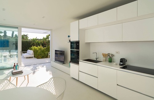 The villa revolves around a welcoming, bright living space that includes a dining area and a modern kitchen. Thanks to the large windows, this area opens evocatively onto the garden and the pool, creating an atmosphere of connection with the outdoor spaces. The equally bright sleeping area hosts two double bedrooms, both with en-suite bathrooms.