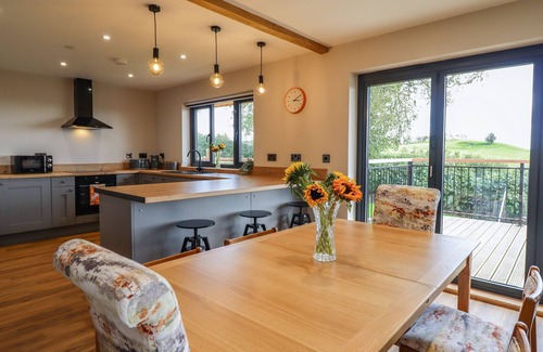 Mynydd Y Glyn Lodge, a detached lodge, comprises an open-plan living space with kitchen, utility, dining area and sitting area with electric fire. Appliances include an electric oven and hob, microwave, fridge/freezer, washer/dryer, dishwasher, an electric fire and a Smart TV. The bedrooms consist of a super-king-size (zip/link), and a king-size with en-suite shower room, along with an additional shower room. Outside, there is an enclosed decking with seating and wood-fired hot tub, along with off-road parking for six cars. Within 2.7 miles, you will find a shop and pub and please note, this property welcomes two well-behaved dogs, but is non-smoking. WiFi, fuel, power, bed linen, and towels are all included in the rent. Highchair and travel cot available on request. Enjoy a memorable escape to Wales at Mynydd Y Glyn Lodge. Note: Ramp access into lodge.Note: This property has a minimum of 3 nights restriction. Please note: this property can only accommodate 3-nights minimum.