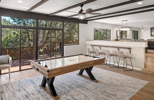 - Upper level features a fully stocked kitchen, dining for 8, and air hockey table