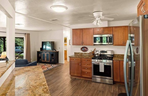 This updated 2-bed, 2-bath home offers a relaxing retreat with stunning red rock views. The master bedroom features a comfortable king bed, an ensuite bathroom with a walk-in shower, and a TV for added convenience. The second bedroom, with a queen bed, offers scenic views of the surrounding area, allowing guests to wake up to nature's beauty.