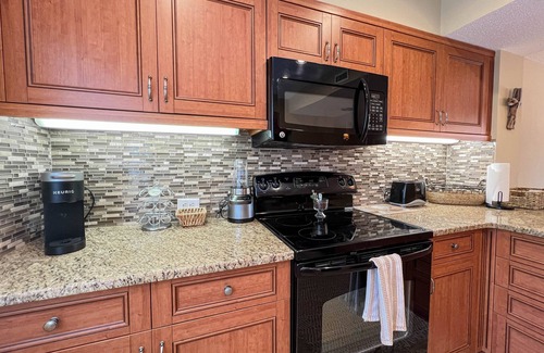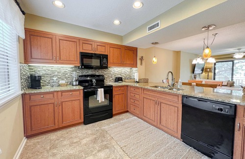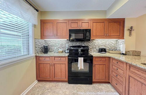 Our residence is a wonderfully cozy 2-bedroom, 2-bathroom ground floor villa located in the St. James Park community of Kingston Plantation...providing direct lakefront views! Our home has been recently renovated with ALL imaginable upgrades! There is ample sleep space for our guests including a King bed in the master bedroom and 2 Queen beds in the guest bedroom! Remodeled features include a renovated, fully operational kitchen with all upgrades such as black appliances, wood cabinetry, granite countertops, modern/contemporary pendant lighting above the bar and beautiful tile back-splash! New furniture pieces throughout...decorated in a comfortable Pottery Barn coastal motif! New in 2024 ...65 inch Roku Smart TV in the living room. High-def flat screen TV's in both bedrooms!