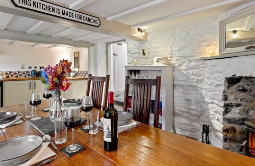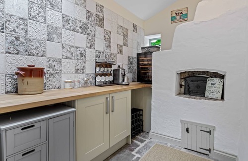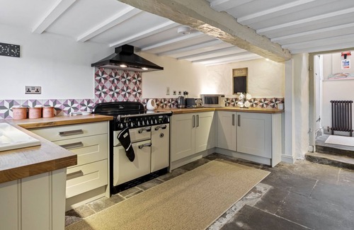 With its cream cabinetry, warm wooden worktops, and eye-catching patterned tiles, the kitchen at Myrtle Cottage feels instantly inviting. The beamed ceiling and flagstone floor add a sense of history, while well-placed lighting keeps the space bright and cheerful. Thoughtfully equipped for everything from hearty breakfasts to home-baked treats, it's as practical as it is welcoming.