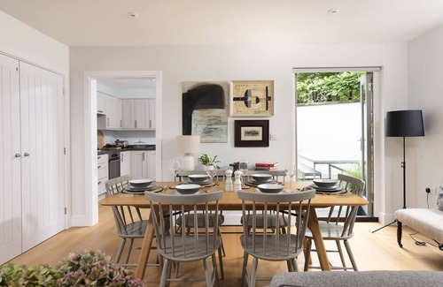 The dining table comfortably seats six. Sitting within the open plan living area offers a wonderfully social setting to enjoy long evening gatherings with a Cornish seafood feast.