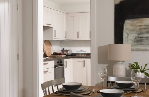 Entering into the spacious open plan living and dining area there is space to kick off your shoes at the entrance and feel at home instantly. It is the heart of the house with a large leather sofa and two grey armchairs to relax and unwind of an evening. The wood burner is nestled in the centre of the room and the TV is ideal for gathering everyone together for a film after a day exploring the coast.