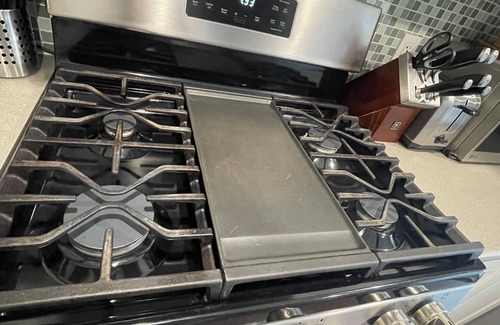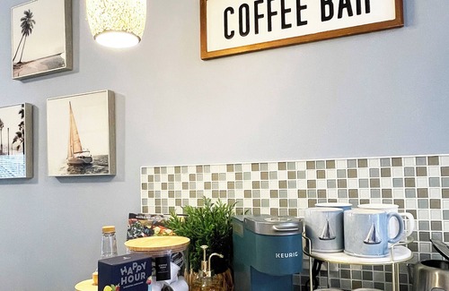 The kitchen is fully equipped with a gas stove, dishwasher, fridge, freezer, including pots and pans, a Keurig machine and a fully-stocked coffee bar, including all the essentials you need to cook up a delicious home-cooked meal.