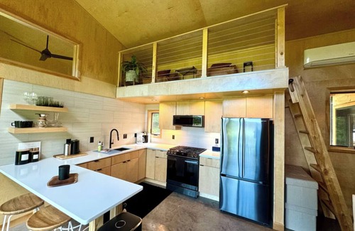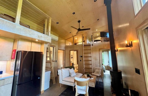 Enjoy our brand new 2-bedroom abode equipped with a cozy fireplace, sleek bathroom, kitchen, and outdoor deck and firepit. There are cozy lofted spaces including a TV nook and reading nook: no sleeping is allowed in the lofted areas. The bedrooms and living area are on the main floor.