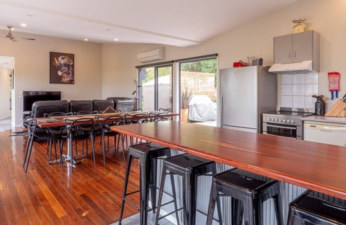 The open plan living area gives easy access to a well equipped kitchen with all of the needed mod cons on hand. A dining table that comfortably seats 10 and a large well seated comfortable lounge area. A cosy wood fire will warm the house during the chilly winters with plenty of fire wood on hand plus there is a split system for extra heating / cooling.