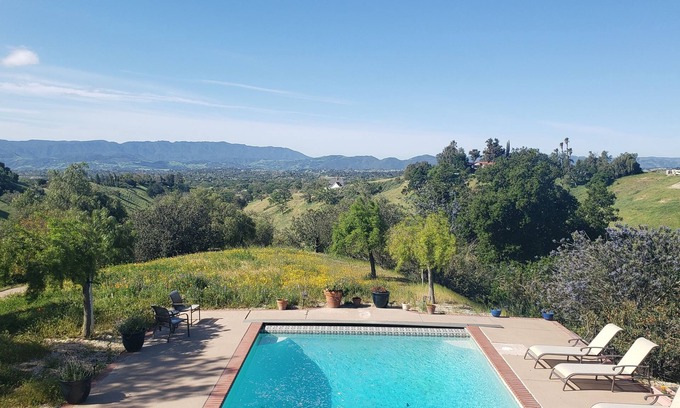 MYSTICAL, MAGICAL MOUNTAIN RANCH Guest Quarters with Large Living Room, Spacious Bedroom w/TVs, Private Bathroom with Art Stone Shower. 10 Minutes from Santa Ynez, Los Olivos, Solvang, restaurants and wineries . Country atmosphere for walking, hiking, biking and enjoying the local wineries. Beautiful views from each window, peace, and meditative solitude ..Spacious living room ,bedroom and bath. Kitchenette with morning Keurig coffee and large refrig. Living Room with 65" big screen TV, electric fireplace, bedroom with Cal King size bed. Private entrance and parking. Pool seasonally heated. Hot Tub available year round