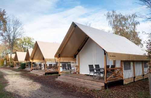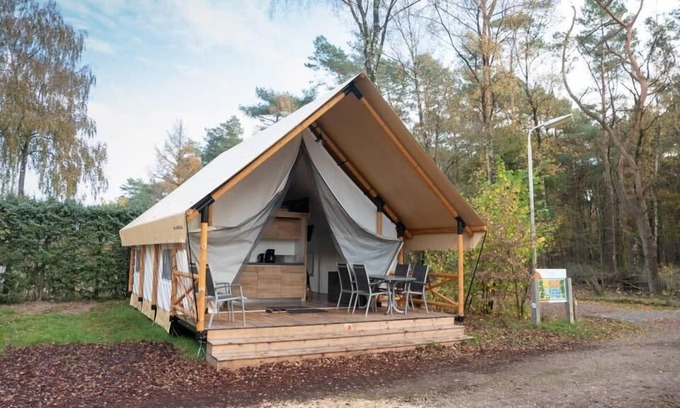 The Glamping tent Luxery 6 is a spacious glamping tent with everything you need for a comfortable stay. The glamping tent is suitable for 6 people and can be reached via a small staircase. The living area has a dining area and a compact and modern kitchen with a fridge, induction cooking plate and filter coffee machine. On the ground floor there are 2 bedrooms with 1 double bed and 2 single beds. In the sleeping loft there is a double bed and it can be reached via the ladder. The bathroom has a shower, toilet and sink. The glamping tent has no heating. Outside you can enjoy a veranda with garden furniture and a beautiful view. You can park 1 car at the glamping tent and have free Wi-Fi.