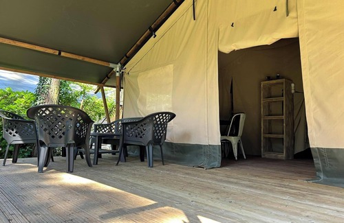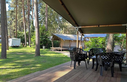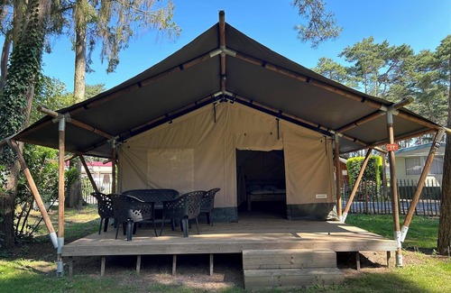 Safari Zelt 4 is a cozy tent suitable for 4 people. Here you experience the feeling of camping, but with the luxury of a furnished tent with beds, kitchenette and dining area. There are two bedrooms in the glamping tent, one with a double bed and one with a bunk bed. In addition, there is a kitchenette with kettle and filter coffee maker. There are no sanitary facilities in the glamping tent, for which you can go to the toilet building at the holiday park. On the terrace with garden furniture you can enjoy the beautiful trees and nature around you. You can also use the free Wi-Fi.