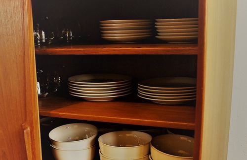 Kitchen equipped with refrigerator, oven range, toaster, rice cooker, cutlery etc