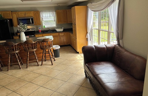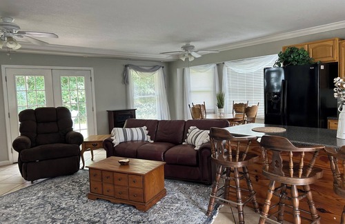 This lovely 2 bedroom 1 bath cottage sits on acres of flat land with a large beautiful pond and dock. This home is located on our personal property which is all completely fenced in and includes a locked and coded gate to enter. We live on top of the hill in our main home. We are excited and pleased to open this home to you and your family!