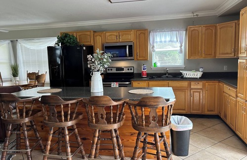 The pond is stocked with fish so bring the fishing poles! Nice open floor plan kitchen and sitting area overlooking the pond. Includes Wi-Fi.