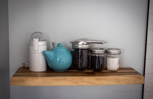Off street parking three steps down to door. Private gated patio is a perfect space to chill. Suite is cozy in winter, cool in summer. Heated tile bathroom floors with shower and oversized tub. Washer and dryer within suite. A complete kitchen with dining table that seats 4. Dishwasher, fridge, stove, oven, microwave, dishes and cookware. Kicking Horse Coffee, Silkroad Tea, cream, and sugar provided gratis for your enjoyment. Oak floors throughout with area rugs and comfortable Scandinavian furniture in living room. Original local art. A fresh and clean environment.