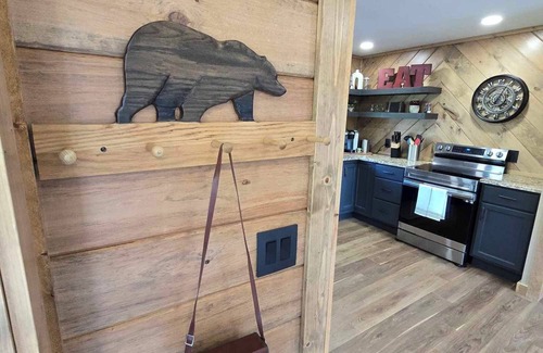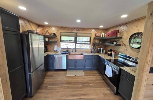 This cabin’s rustic tongue-and-groove walls, new flooring, and fully remodeled kitchen and bathroom make it warm and stylish, while the spa-like rain shower brings a splash of decadence to your mountain hideaway.