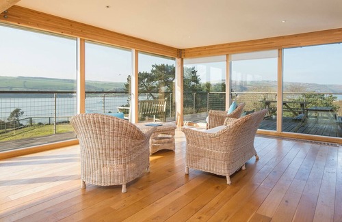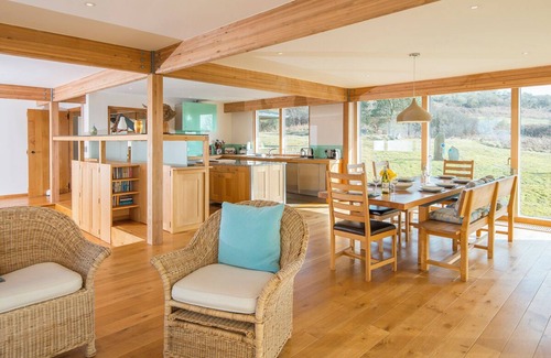 Nantsaeson will simply take your breath away with its stunning views. This contemporary detached house enjoys a unique design and rests in the sand dunes above the coast in Gwbert at the mouth of the river Teifi estuary.Step into the open plan living space on the first floor with its floor to ceiling glass on three sides making the most of the panoramic views up the river Teifi, across the estuary towards the golden Poppit Sands beach and out to sea over Cardigan Bay. Comfortably furnished in a clean minimalist modern style with oak and slate floors throughout, it reflects the natural surroundings. The well-equipped modern wood and stainless steel kitchen is ideal for preparing family meals to be enjoyed around the refectory style dining table, there is plenty of easy seating to relax on while you enjoy the all encompassing view. Doors lead out to the wrap around decked balcony, wonderful for enjoying an alfresco meal, steps take you down to the large garden which gives plenty of space for children to play amongst the dunes.All the bedrooms have a water view, the master has to be the best with glazed doors leading out to your own balcony, so you can really soak up the stunning views and the twin room is ideal for children. There is a an additional sitting room on the second floor, the perfect place to escape to and relax - the aspect is panoramic.Ideal for boating enthusiasts with the nearby yacht club, while The Cliff Hotel with its spa, cafes, and golf course are all within walking distance. Across the water is the beautiful Poppit Sands and the start of the Pembrokeshire Coastal Path, a wonderful way to explore this stunning coastline, there is a plethora of golden beaches both north and south including Aberporth, Tresaith and Newport. The bustling market town of Cardigan with its golf club, farmer’s market, pubs, restaurants and independent shops and its best kept secret Cardigan Castle is only a 5 minute drive away. Take a boat trip out into Cardigan Bay to see the resident dolphins, porpoises and grey seals, it is sure to be the highlight of any holiday.Nantsaeson enjoys the most idyllic position and once here you will just not want to leave. £150 bond required. Part of the Bond covers the usage of the barbecue. If the barbecue is not left in the same, clean condition on your departure, £25 will be deducted from the Bond for rectifying this.