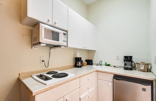 KITCHENETTE: Stovetop, mini fridge, coffee maker, microwave, dishware/flatware, basic cooking essentials