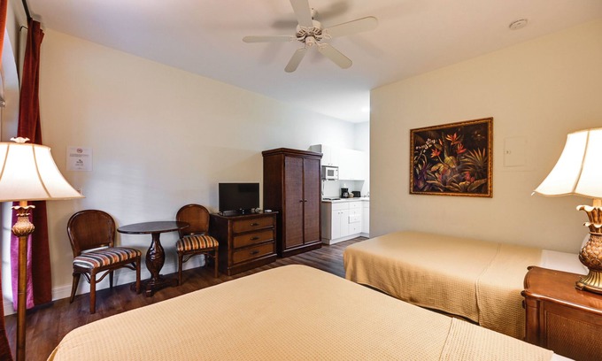 STUDIO AMENITIES: Smart TVs, ceiling fans, breakfast table
