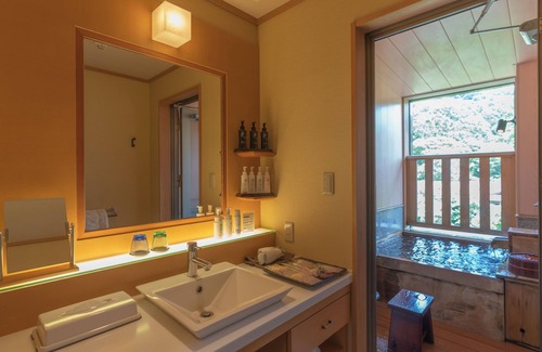 While you're here, you can enjoy all the comforts of home and more, including a spring water bathtub and a refrigerator, as well as free WiFi and a flat-screen TV. Other amenities include premium bedding, down comforters, towels, and slippers.