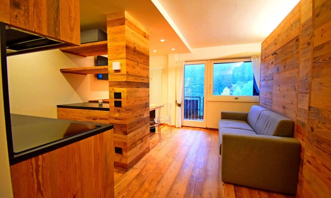 New completely renovated studio apartment, furnished in modern Alpine style with the use of quality local materials, such as larch wood, to create a warm and welcoming atmosphere that will make your holiday in the mountains enjoyable. The apartment consists of an entrance hall where we find 2 "foldaway" bunk beds, a bathroom with a splendid shower, an equipped kitchen, a living area with a sofa which disappears when necessary, revealing a very comfortable double bed (a real bed!), dining area with table, bench and chairs for 4 people, large balcony facing west with a very quiet view towards the river and from which you can enjoy a beautiful view of the mountains. The apartment is located inside the Nardis condominium. The comfortable and quiet residential area is located a few steps from Laghetto di Campiglio, about 350 mt. from the Spinale cable car, and about 700 mt. from the central square of Madonna di Campiglio.