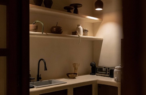 Its bond with the outside by a terrace dressed with a robust face table, bathes in light through its large window, a kitchen integrated into the space. As decorative elements, clay, ceramics and jute show our identity.