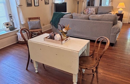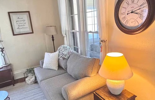 Step inside and you'll be greeted by original hardwood floors, high ceilings, and an abundance of natural light. Each room features plush seating and cozy accents, creating a serene space to unwind.
