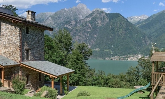The vacation villa is located on a large, unfenced property on a hillside surrounded by meadows, forests, mountains, and Lake Mezzola, only about 15 minutes from Lake Como. The garden is terraced with stone walls surrounding the house.