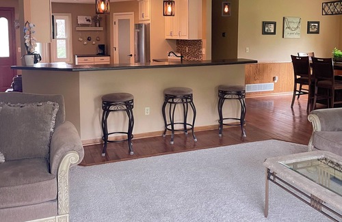 Guests can enjoy sitting on the front patio or deck with a cool drink while watching the wildlife in the yard. There are two families of turkeys, many deer and lots of bunnies and squirrels for guests to admire. There are swings and some sports equipment available for guest use in the yard. In the winter, guests can enjoy the spacious yard to build a snowman, snow shoe or even snowmobile from the property.